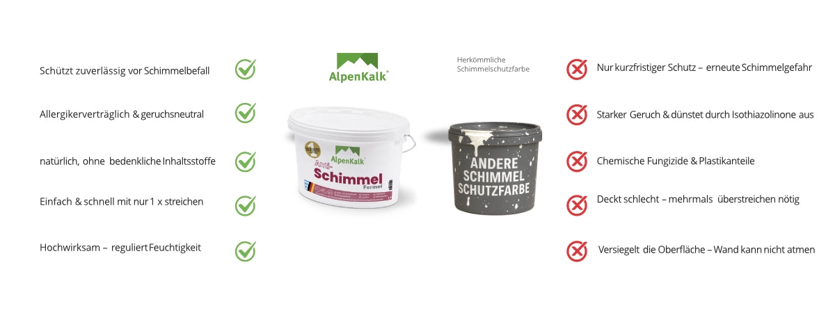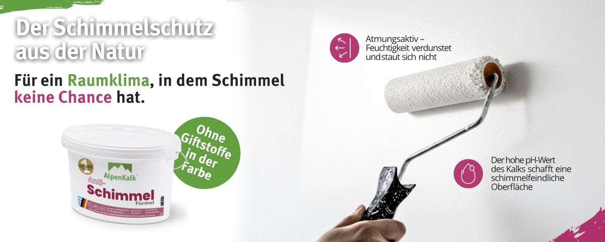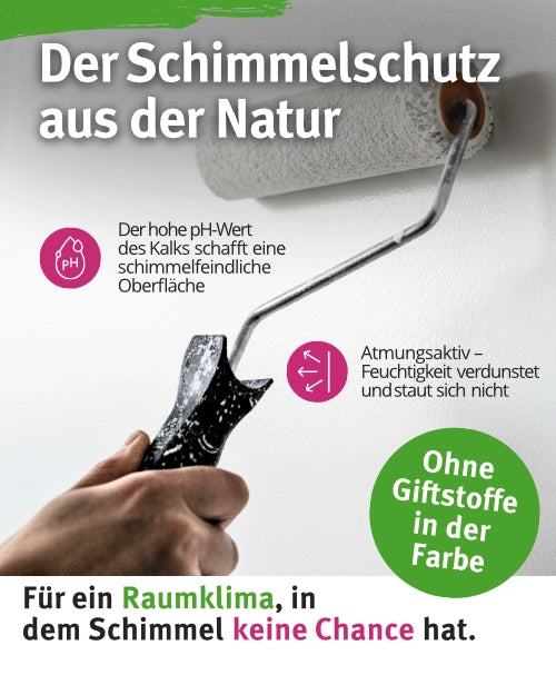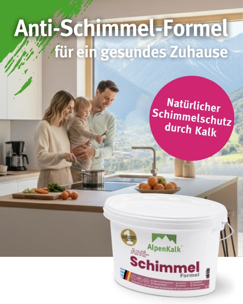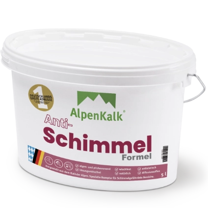Anti-Schimmel-Farbe von AlpenKalk für gesundes Wohnen. Dieser Anti-Schimmel-Farbe aus Kalk ist ohne Konservierungsstoffe, frei von synthetische Bindemittel, lösungsmittel- und weichmacherfrei. Frei von lästigen Gerüchen usw.