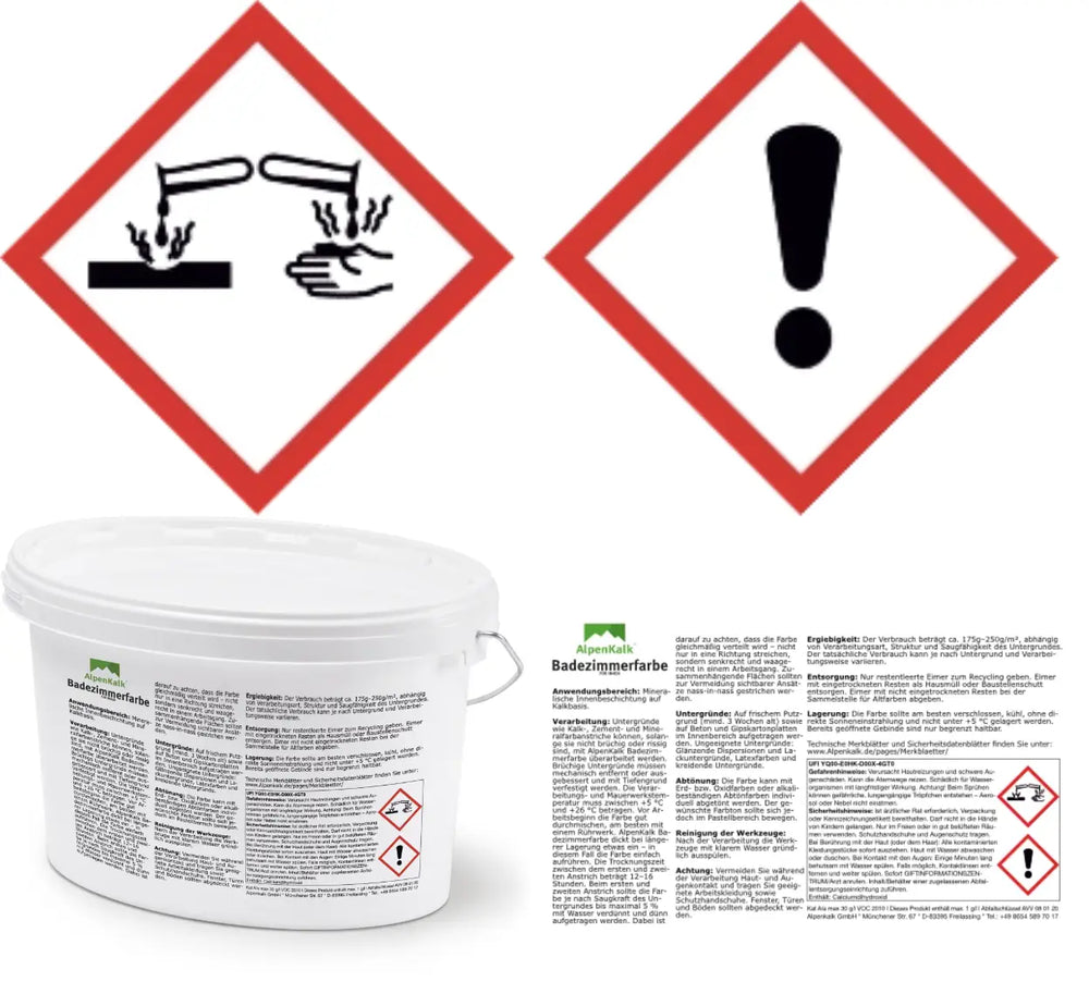 AlpenKalk Badezimmerfarbe sind gut verschlossen und bei frostfreier Lagerung mehrere Jahre haltbar.