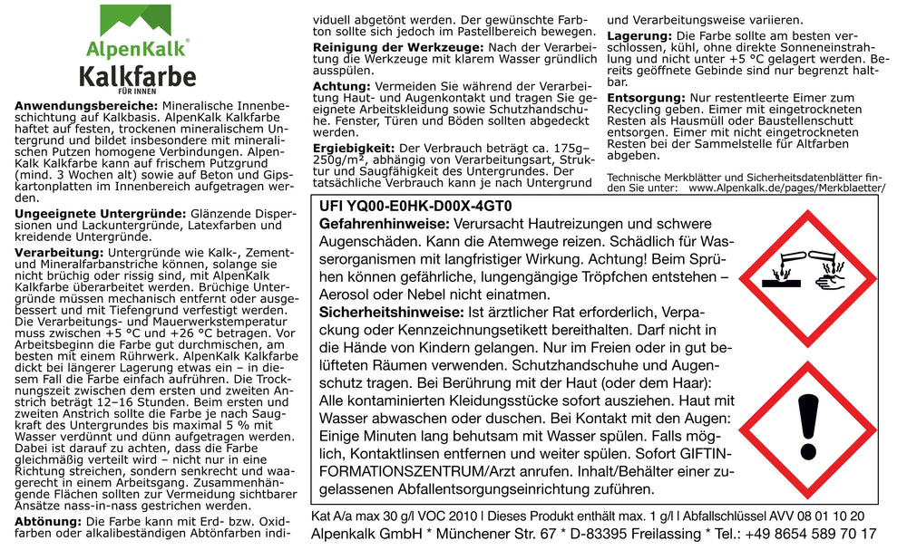 AlpenKalk Premium Kalkfarbe sind gut verschlossen und bei frostfreier Lagerung mehrere Jahre haltbar.