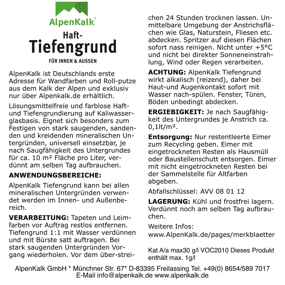AlpenKalk Tiefengrund wird auf alle mineralischen Untergründen: Putz, Gipskarton, Gips-Spachtelmasse, Beton, Faserzementplatten, Mauerwerk und auf Anstrichen usw. im Innen- und Außenbereich aufgetragen.